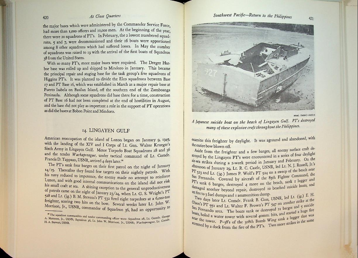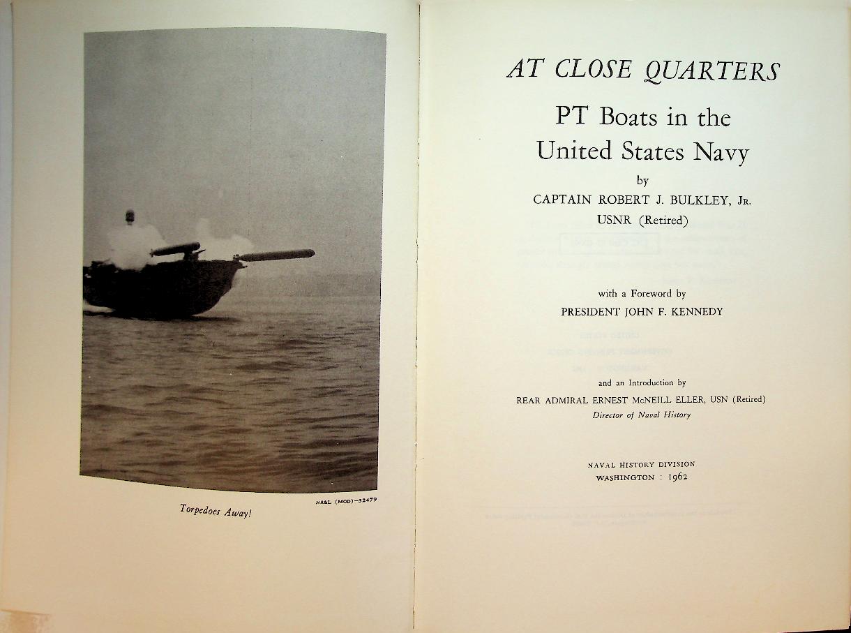 Bulkley, R.J.: 1962 Washington, hardcover 574 pages, with index and photographs. official history of US Navy patrol torpedo boats in the Second World War by Robert J Bulkley, himself a former PT boat commander. The book describes PT operations in both the Pacific and European theaters, covering tactics, equipment and individual actions in detail and explaining how these small but fast and heavily armed craft were used for attack, patrol, rescue and special operations throughout the war. In very good condition