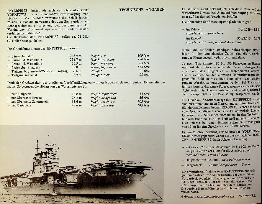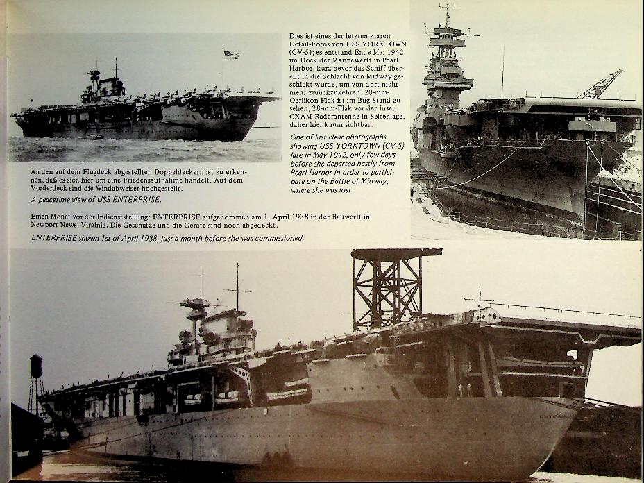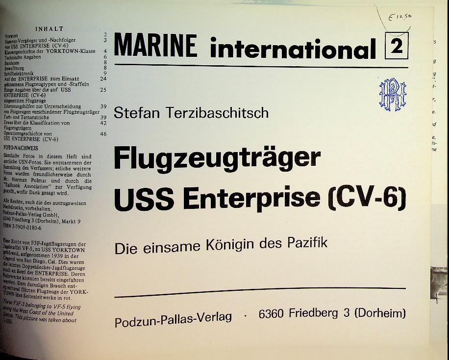 Terzibaschitsch, Stefan: 1982 Germany, softcover 48 pages. Marine International 2 by Stefan Terzibaschitsch is a compact, photo-rich monograph on the U.S. aircraft carrier USS Enterprise (CV‑6), nicknamed “The Lonely Queen of the Pacific,” focusing on her design, wartime operations in the Pacific, and visual details for enthusiasts and modelers. The book was published by Podzun-Pallas in Germany and carries. ISBN 9783790901801 / 3790901806 In very good condition. German language