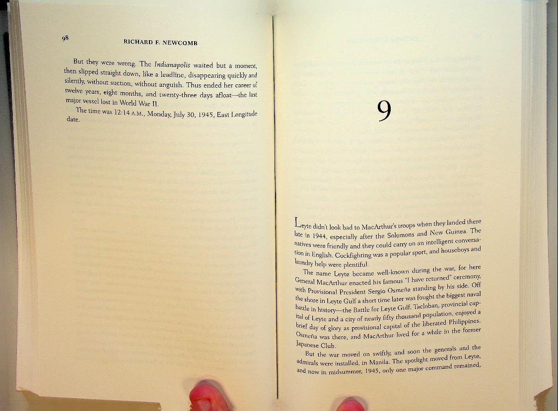 Newcomb, R.F.: 2000 US, hardcover with dust jacket 326 pages, with photos. Richard F. Newcomb recounts the torpedoing and sinking of the heavy cruiser USS Indianapolis in July 1945 and the horrific ordeal of the survivors left drifting for days among sharks, thirst, and exposure in the Pacific Ocean. The book also examines the controversial Navy investigation and court‑martial of Captain McVay, highlighting issues of responsibility, scapegoating, and eventual vindication decades later. ISBN 9780380819041 in very good condition