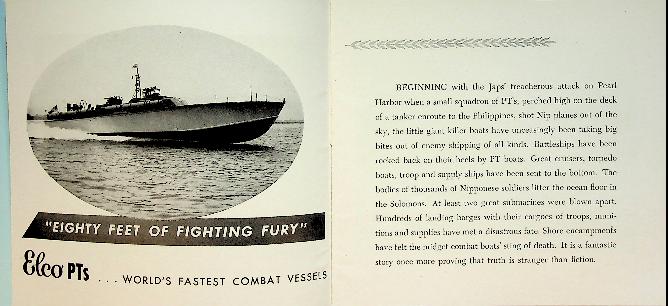 Elco, Electric Boat Company: about 1945 New York Bayonne, softcover, 25 pages, with photos and information of the Elco PT's boats, with references to WW2 and their results. In very good condition. Small and Very rare!