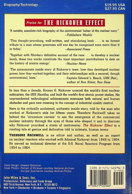 Rockwell, T: 1995 Canada, softcover, 411 pages, illustrated. The book describes how Admiral Hyman G. Rickover, through relentless vision, technical rigor, and unorthodox leadership, created the U.S. nuclear Navy and permanently changed naval warfare and nuclear engineering. Drawing on his fifteen years working directly with Rickover, Theodore Rockwell offers an insider’s portrait of a brilliant, demanding, and often controversial figure who battled bureaucracy and industry alike to impose unprecedented standards of safety and excellence. ISBN 9780471122968 In very good condition