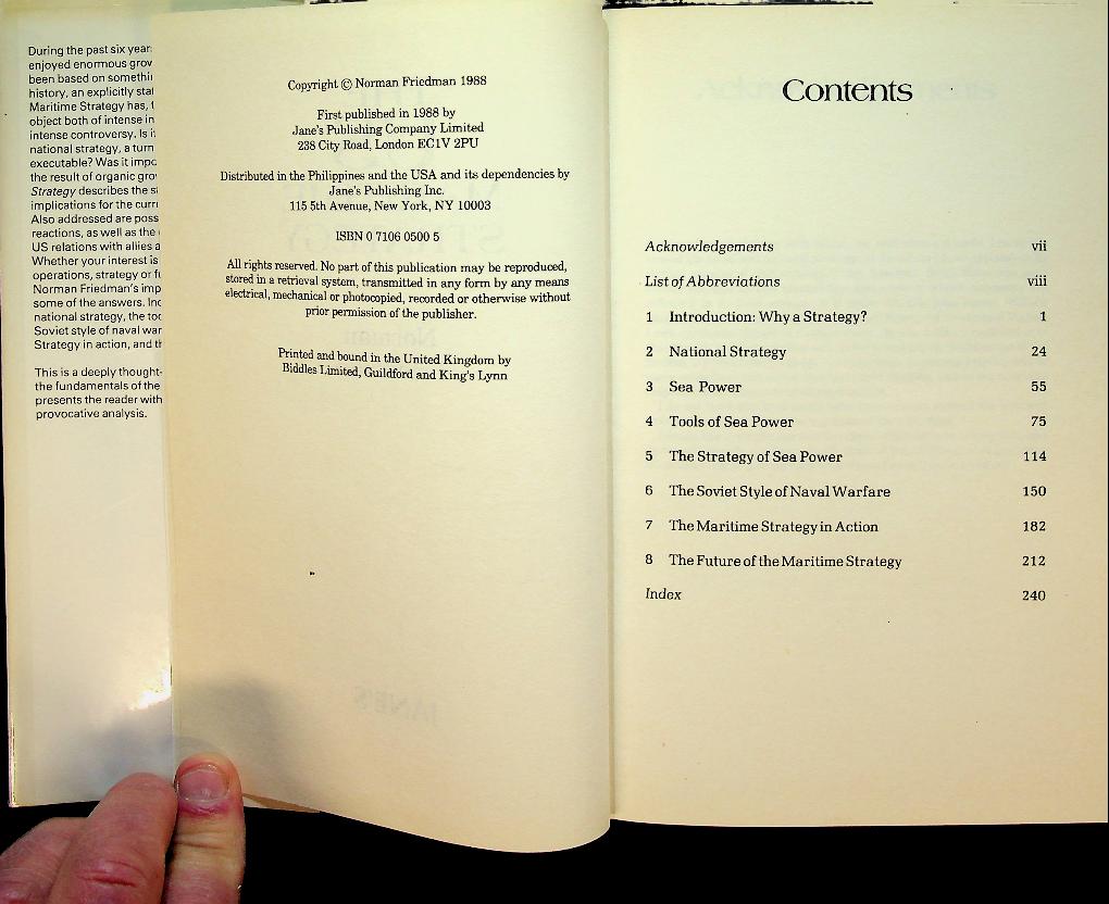 Friedman, Norman: 1988 Jane's London, hardcover with dust jacket, illustrated. The book analyzes how U.S. naval thinkers in the 1970s and 1980s rebuilt American sea power into a forward, offensive maritime strategy aimed at pressuring the Soviet Union’s flanks and homeland from the sea. Friedman links this strategy to the planned 600‑ship Navy, explaining how force structure, technology, and global deployments were orchestrated to achieve deterrence and strategic advantage in the late Cold War. ISBN 9780870219733 / 0870219731 In very good condition