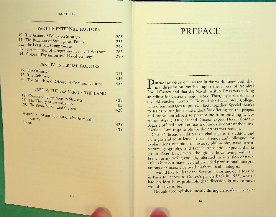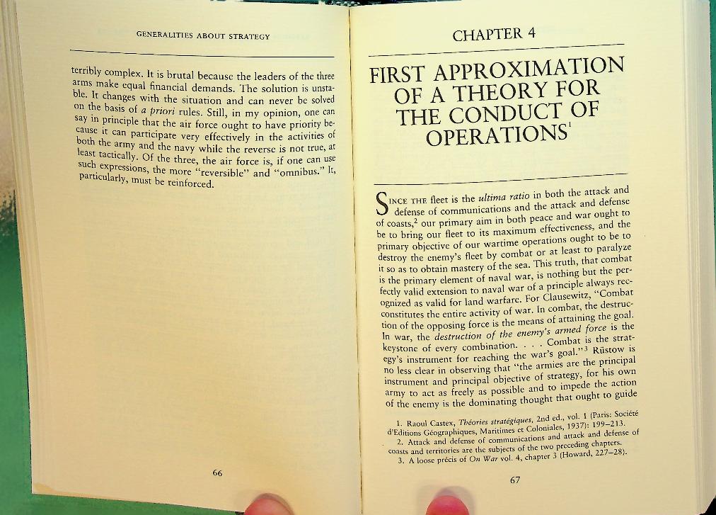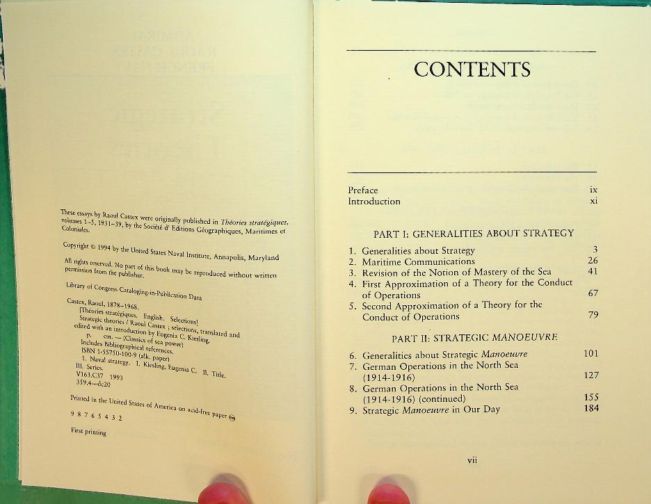 Castex, Admiral Raoul: 1993 Naval Institute Press, hardcover 445 pages. An abridged English translation of Admiral Raoul Castex’s classic five-volume work, explaining how strategy connects policy, geography, and sea power to shape national security. It analyzes the role of maritime forces, command of the sea, and operational concepts such as strategic manoeuvre, “stratégie générale,” and “perturbation” to guide modern naval and joint planning. ISBN 9781557501004 In very good condition