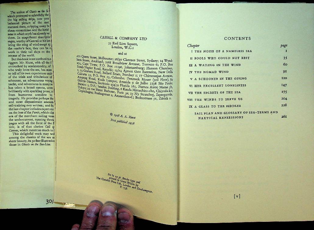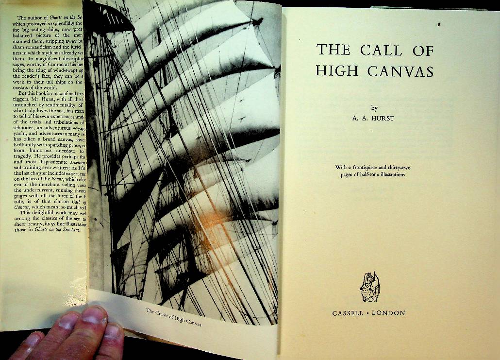 Hurst, A.A.: First edition 1958, hardcover with dust jacket 272 pages, with photos. “The Call of High Canvas” is a classic work of sailing literature that evokes the final decades of the great square‑rigged sailing ships, portraying the harsh routines, dangers, and camaraderie aboard the tall ships around 1870–1910. Drawing on the experiences and testimony of seamen, Hurst gives a vivid, balanced picture of the men who crewed these big sailing vessels as steam power was beginning to eclipse their world. In very good condition.