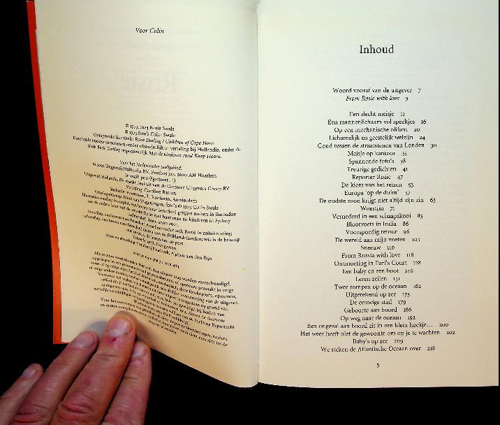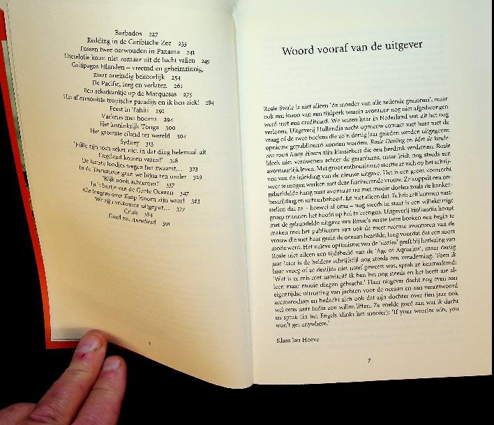 Swale, Rosie: 2003 Hollandia, softcover 399 blz. In dit boek beschrijft de geëmancipeerde avonturierster Rosie Swale hoe zij in de jaren zestig liftend van Engeland naar India trekt en daarna met haar man en hun twee jonge kinderen per zeilboot de wereld rond reist, inclusief de barre tocht rond Kaap Hoorn. Het resultaat is een persoonlijk reisverslag vol vrijheid, ontberingen en zelfontdekking, waarin zowel de romantiek van het zwervende bestaan als de praktische en emotionele keerzijde van zo’n extreme reis centraal staan. ISBN 9789064103889 In zeer goede staat
