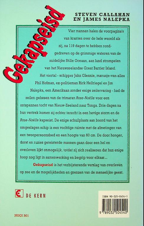 Callahan, S en J. Nalepka: 1994 Baarn, softcover, 255 blz, met foto's. het verhaal van de catamaran Rose-Noelle die in 1989 bij Nieuw-Zeeland kapseist, waarna vier opvarenden 114 dagen overleven op de ondersteboven drijvende romp tot ze aanspoelen op Great Barrier Island. Het boek is gebaseerd op het verslag van stuurman John Glennie en bemanningslid James Nalepka en beschrijft hun gezamenlijke strijd tegen ontberingen, conflicten en onbegrip na de redding. ISBN 9789032504540 In zeer goede staat