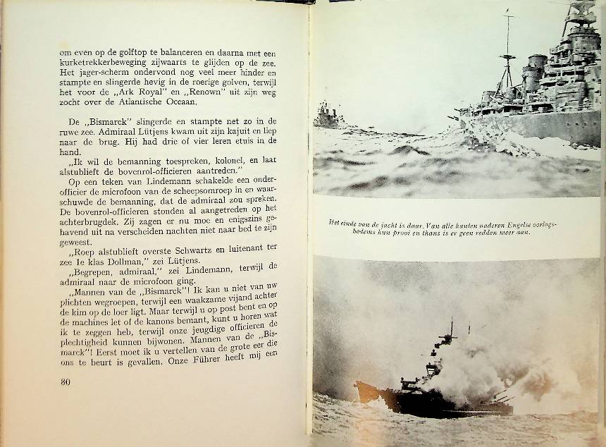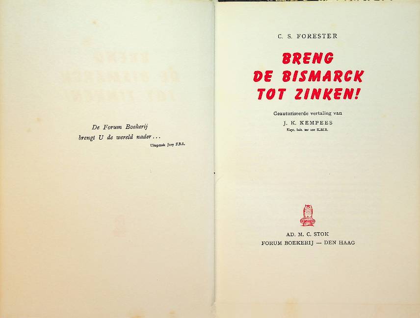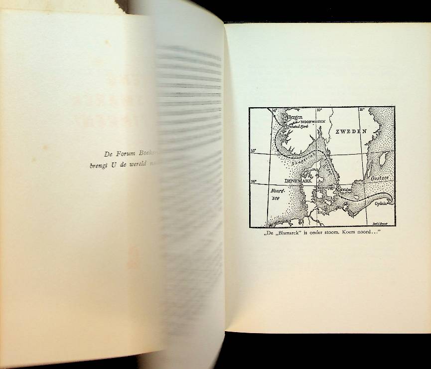 Forester, C.S.: +/- 1965 Den Haag, hardcover zonder papieromslag 138 blz., met foto's. Op waarheid gebaseerde roman. Het boek volgt de koortsachtige Britse jacht op het Duitse slagschip Bismarck in mei 1941, waarbij inlichtingenwerk, strategische keuzes en wanhopige vlootoperaties samenkomen om een dodelijke bedreiging voor de Atlantische konvooiroutes uit te schakelen. Met strakke, documentaire-achtige spanning beschrijft Forester hoe de Royal Navy, na verlies van de Hood, de Bismarck lokaliseert, onklaar laat torpederen en uiteindelijk tot zinken brengt. In goede staat