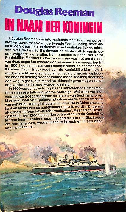 Reeman, D: 1985 Boekerij Amsterdam, softcover 271 blz., 2e deel uit de familiekroniek van de familie Blackwood. 1e deel is Blazoen van eer. "In naam der Koningin" van Douglas Reeman speelt in het jaar 1900 tijdens het einde van koningin Victoria's heerschappij, waarin kapitein David Blackwood van de Koninklijke Mariniers de taak krijgt zich te bewijzen tegen de dreigingen voor het Britse imperium. Wanneer de Boxer-opstand in China ontaardt in een bloedige oorlog, moet Blackwood met zijn troepen het opnemen tegen een fanatieke en wrede vijand om de eer van het Britse Rijk hoog te houden ISBN 9789010054807 / 901004802 in goede staat
