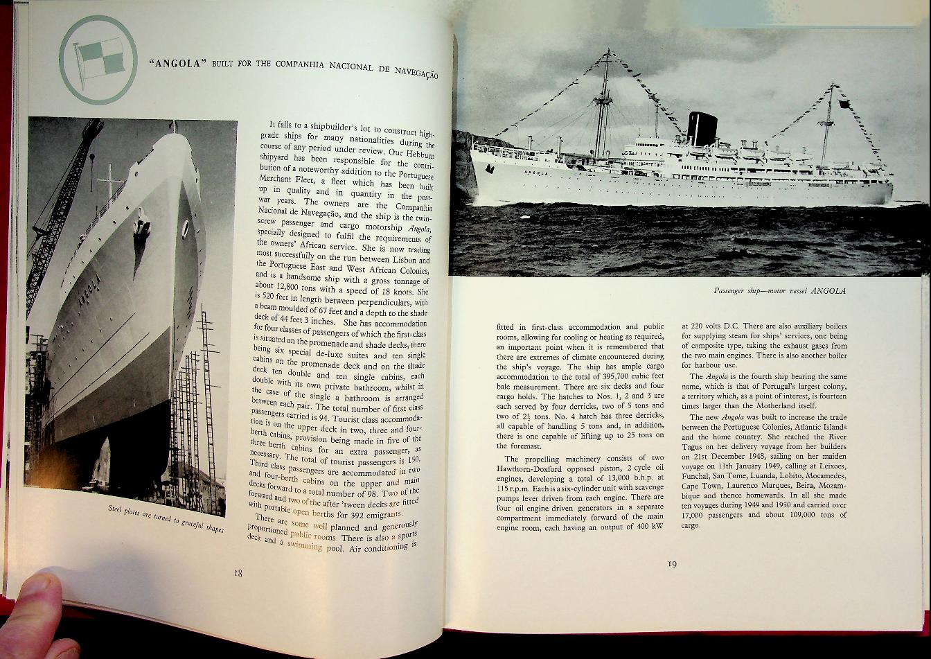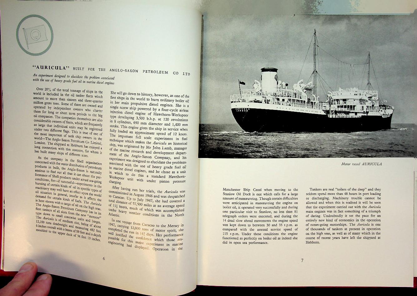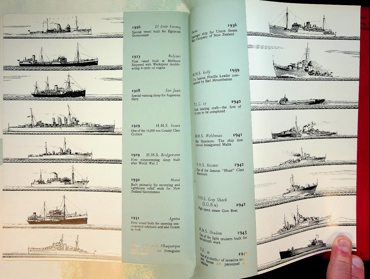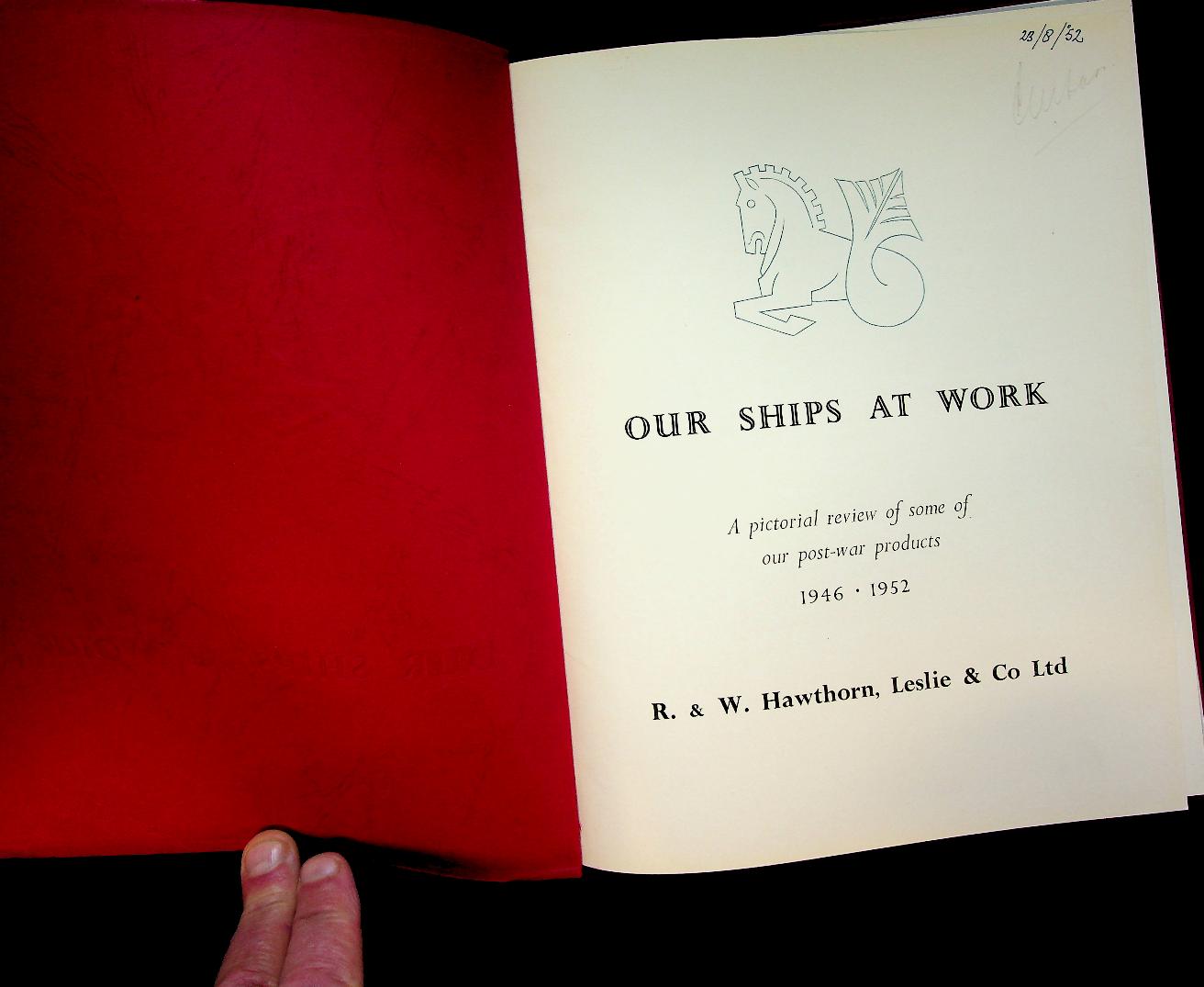 Hawthorn: 1952 UK, softcover 76 pages with photo's and text of build ships. With 8 pages brochure of built ships. Our Ships at Work by R and W. Hawthorn, Leslie and Co Ltd is a pictorial review documenting the shipyard’s post-war output between 1946 and 1952, showcasing a diverse range of naval and merchant vessels constructed by the company. This book highlights the technological expertise and productivity of the Hawthorn Leslie shipyard during a pivotal period of maritime reconstruction after World War II. In very good condition