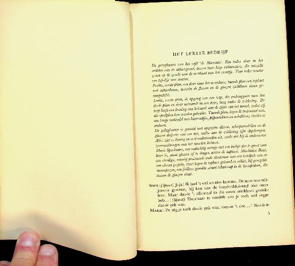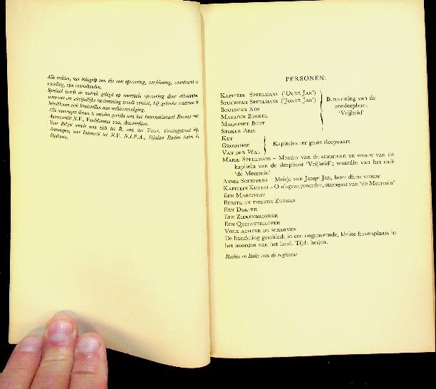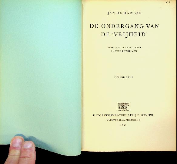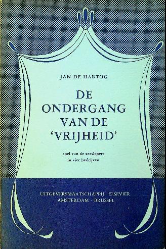 Hartog, Jan de: 1953 Amsterdam, softcover 82 blz. “De ondergang van de Vrijheid” is een vierdelig toneel zeesleepvaart‑stuk uit 1939 waarin bemanningsleden van de sleepboot Vrijheid vechten tegen natuurgeweld, uitbuiting door reders en interne spanningen, waardoor hun idealen over kameraadschap en vrijheid onder druk komen te staan. Het drama toont hoe economische macht en menselijk falen de morele ‘vrijheid’ van zeevarenden uithollen, tot de symbolische ondergang van schip en ideaal samenvalt. In goede staat