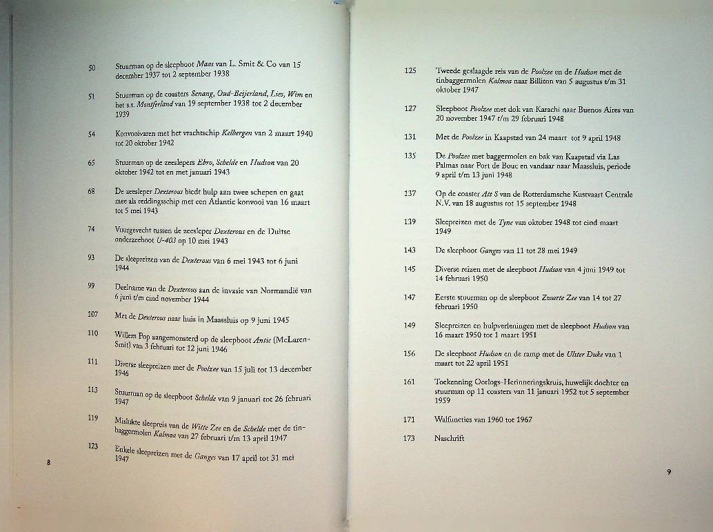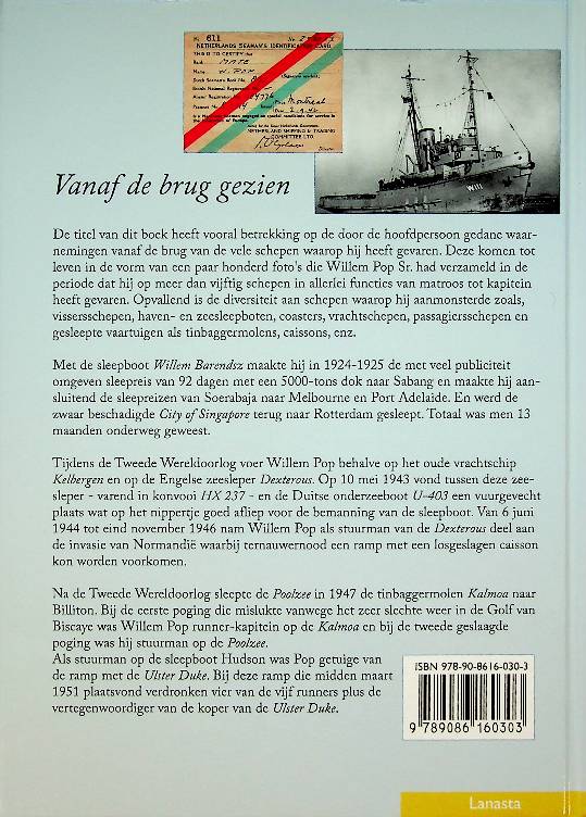 Pop, W.: Lanasta 2008, ingenaaid 208 blz. Na zijn eerste boek over Kapitein B.C. Weltevreden, een van de bekendste gezagvoerders van de Nederlandse sleepvaart verhaalt Willem Pop in zijn tweede boek over Willem Pop senior. Een man die in 1914 op twaalfjarige leeftijd voor het eerst naar zee ging. Verhalen aan boord van de sleepboten Willem Barendsz, Dexterous, Poolzee, Kalmoa en de Hudson, met veel mooie fotografie!. ISBN 9789086160303 In zeer goede staat.