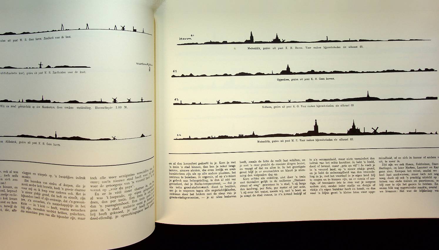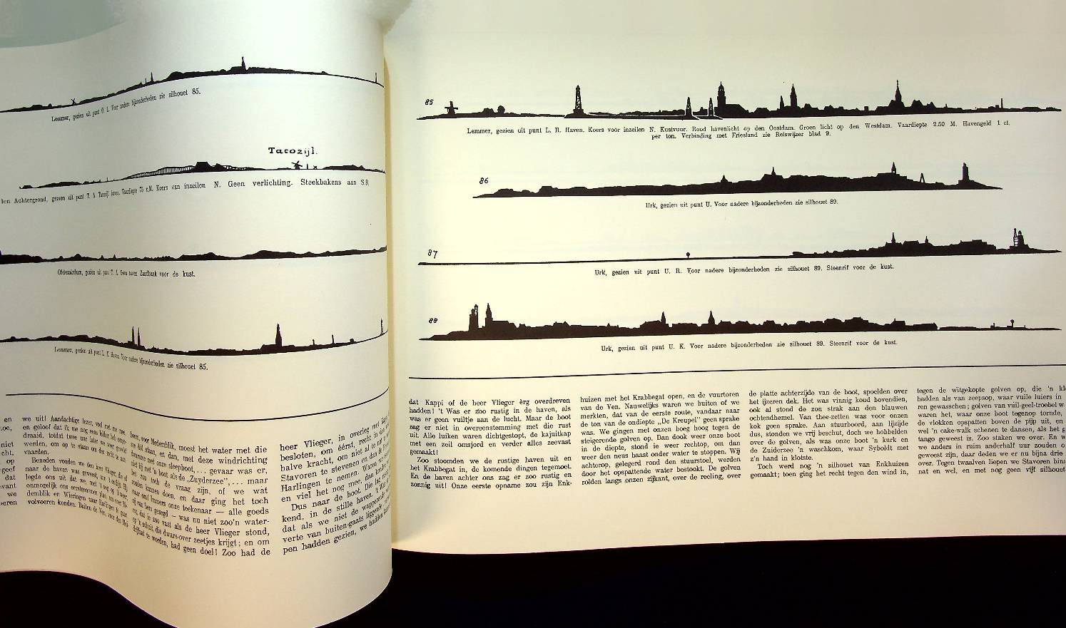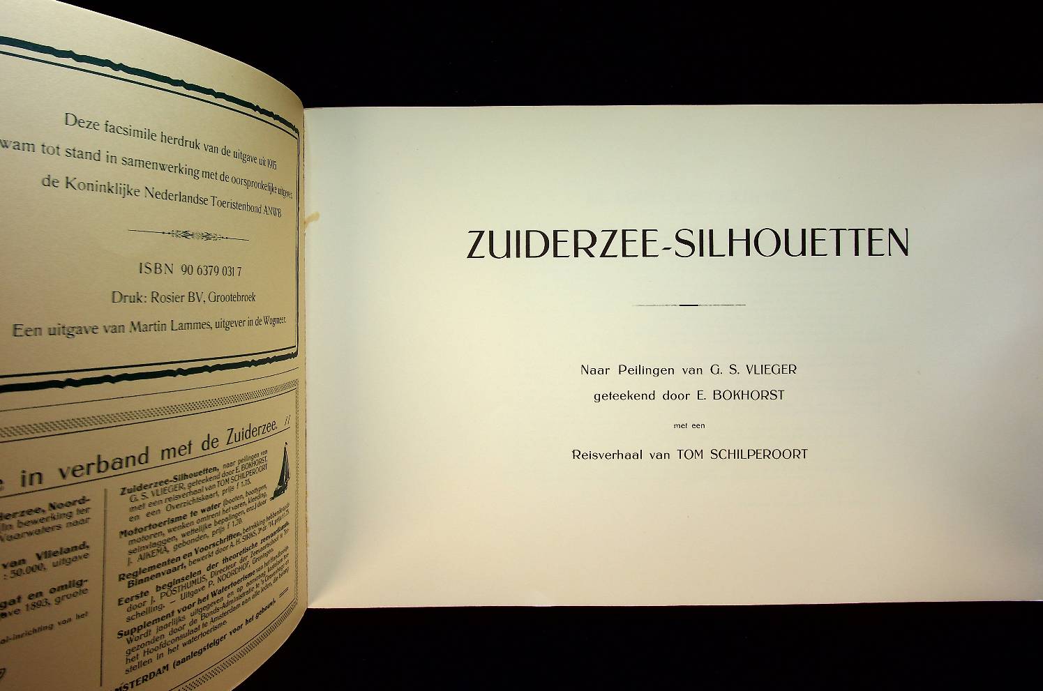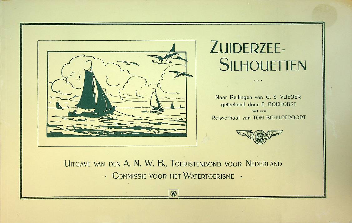 ANWB: Naar peilingen van G.S. Vlieger, getekend door E. Bokhorst, met een reisverhaal van Tom Schilperoort, softcover 39 blz., Zuiderzee-Silhouetten is een ANWB-boekje met door G.S. Vlieger opgemeten silhouetten van Zuiderzeesteden, getekend door E. Bokhorst en aangevuld met een reisverhaal van Tom Schilperoort over een meerdaagse tocht over de voormalige Zuiderzee. Het boek laat zien hoe de havens en plaatsen er vanaf het water uitzagen en vormt zo een historisch-documentaire gids voor de schipper op de Zuiderzee. Facsimile naar de uitgave van de ANWB in de 20'er jaren. In goede staat