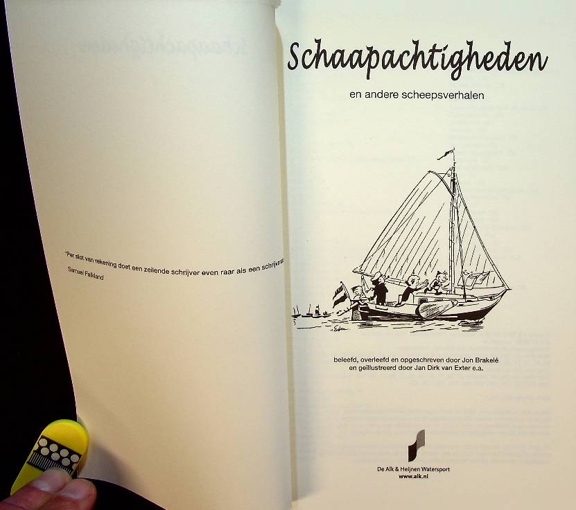 Brakele, J: 2012 De Alk, softcover 160 blz., geïllustreerd. Een echtpaar met twee jonge kinderen koopt in een onbezonnen bui een zeilboot, het Swarte Schaep, en leert al doende – vaak met de nodige schade en hilarische verwikkelingen – de praktijk van het zeilen kennen. Het boek bundelt deze lichtvoetig vertelde, leerzame scheepsverhalen vol herkenbare recreatievaart-situaties voor watersporters en gezinnen die van humor aan boord houden.. ISBN 9789059611061 In goede staat