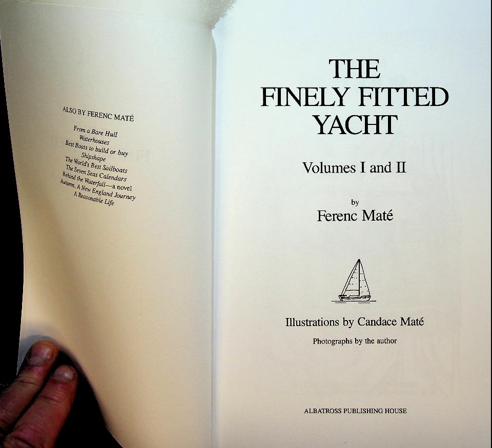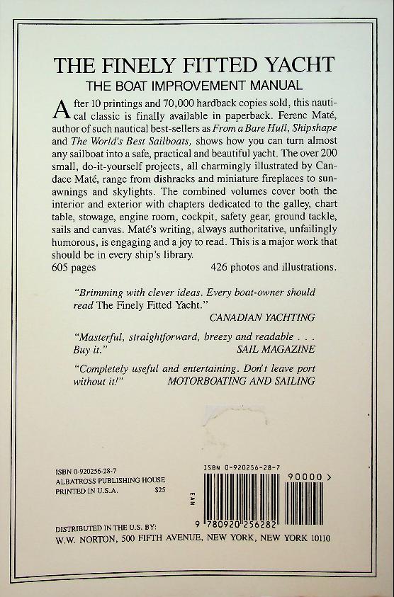 Mate, Ference: 2005 Albatross USA, softcover, 605 pages, illustrated. The Finely Fitted Yacht by Ferenc Máté is a practical boat‑improvement manual with over 200 mostly small, do‑it‑yourself projects to enhance the seaworthiness, safety, comfort and appearance of sailing yachts, covering both interior and exterior fittings. The book, published by Albatross Publishing House. Combined Volume ISBN 9780920256282 In very good condition