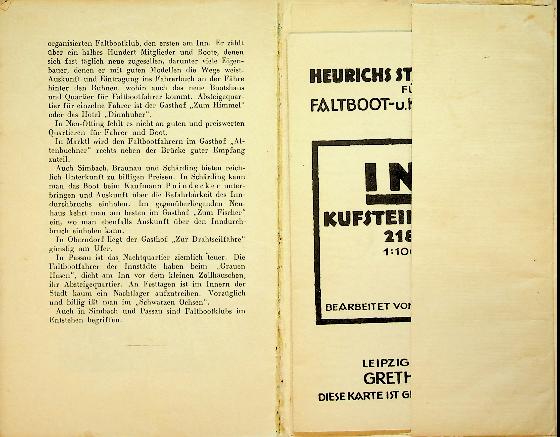 Heurich, Alfred: ca. 1927 Grethlein Germany, softcover, 30 pages and a folding-out route map. Wasser-Führer für Faltboot- u. Canoefahrer, Inn, Kufstein Passau by Heurich is a compact river guide for foldboat and Kanu paddlers that describes the Inn route from Kufstein bis Passau, supplemented with a “Streckkarte” (route chart) for practical navigation and trip planning. In very good condition. German language